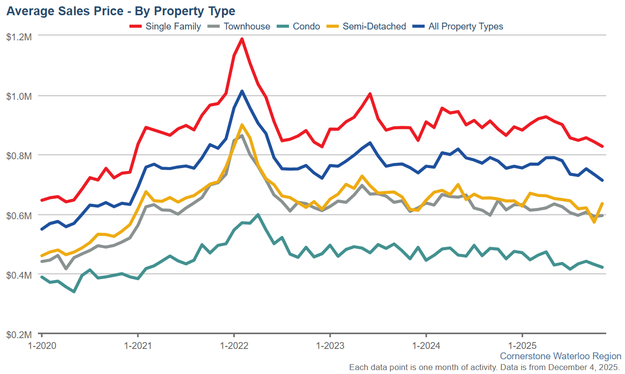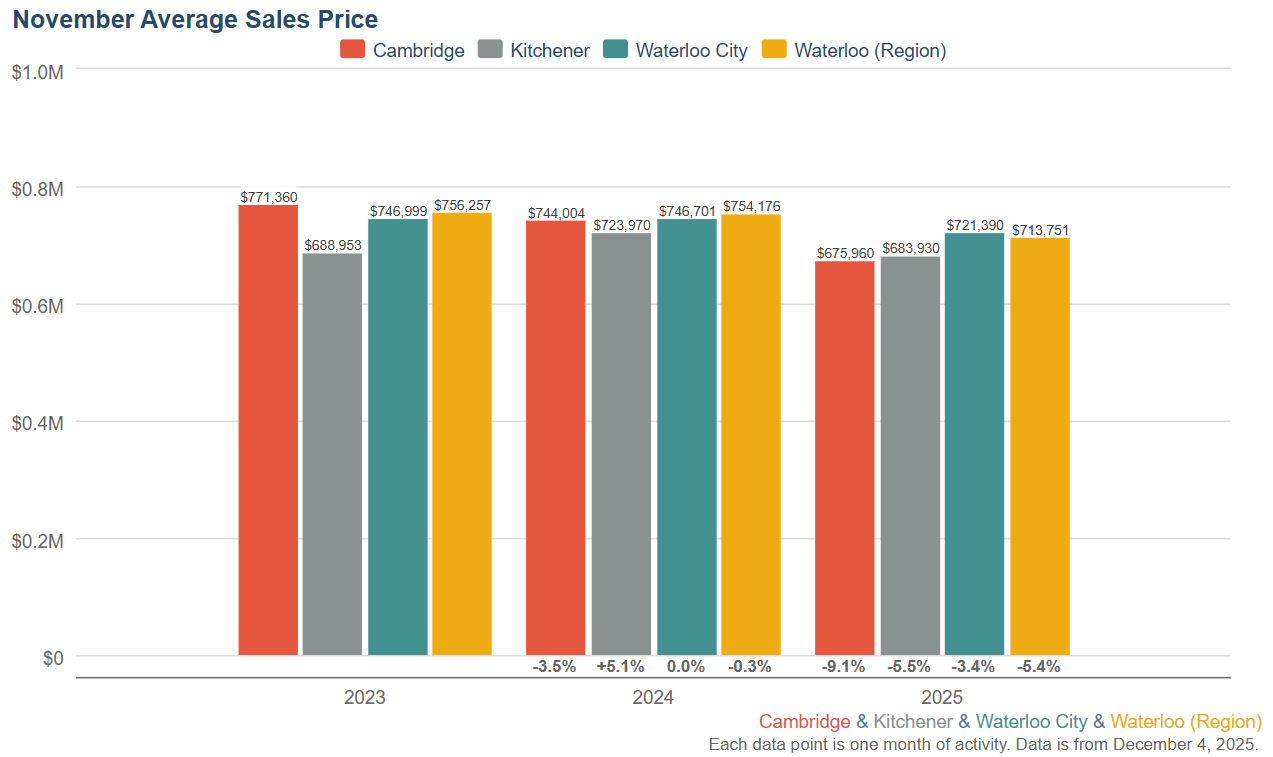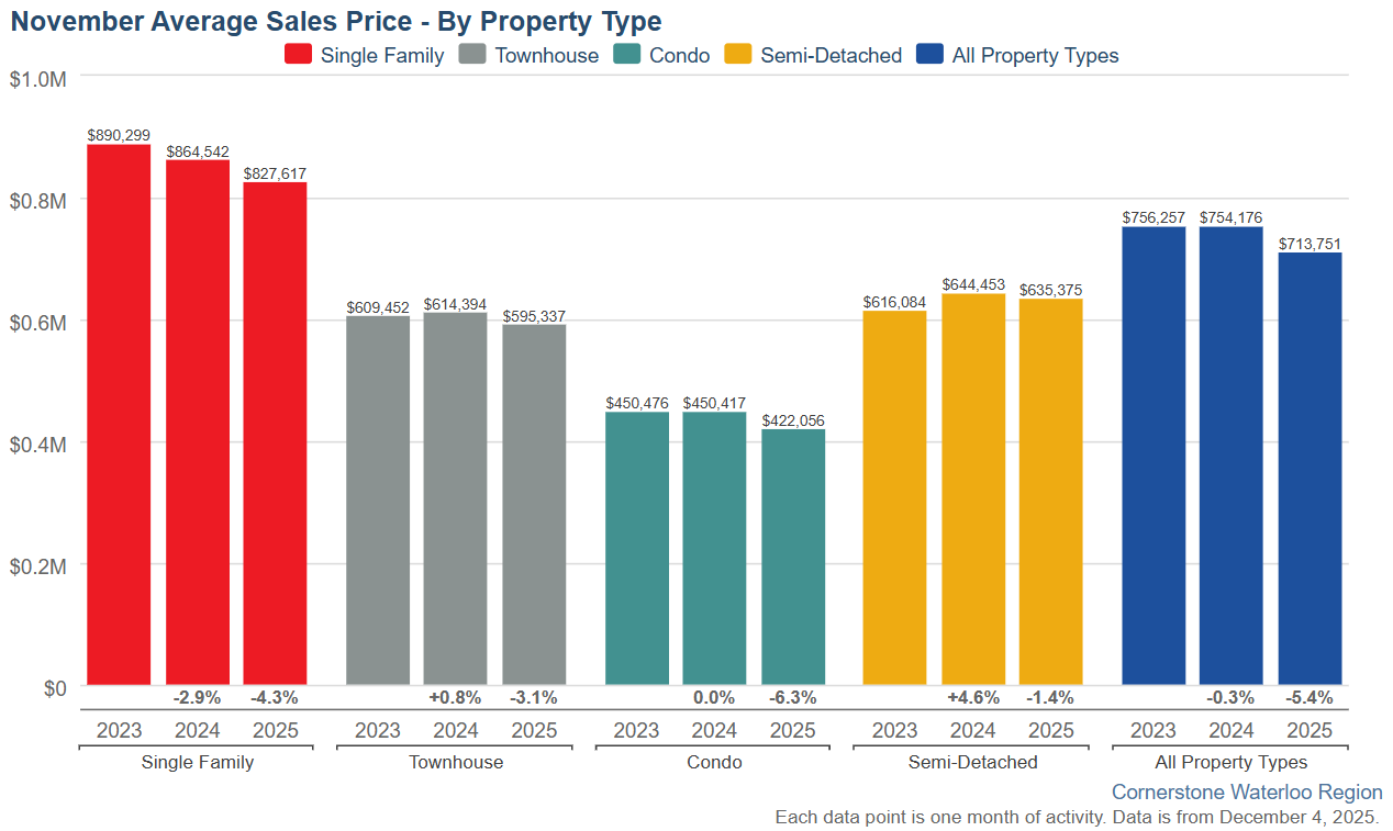 The average sale price of all residential properties sold in November was $713,751, a 5.4% decrease from November 2024.
