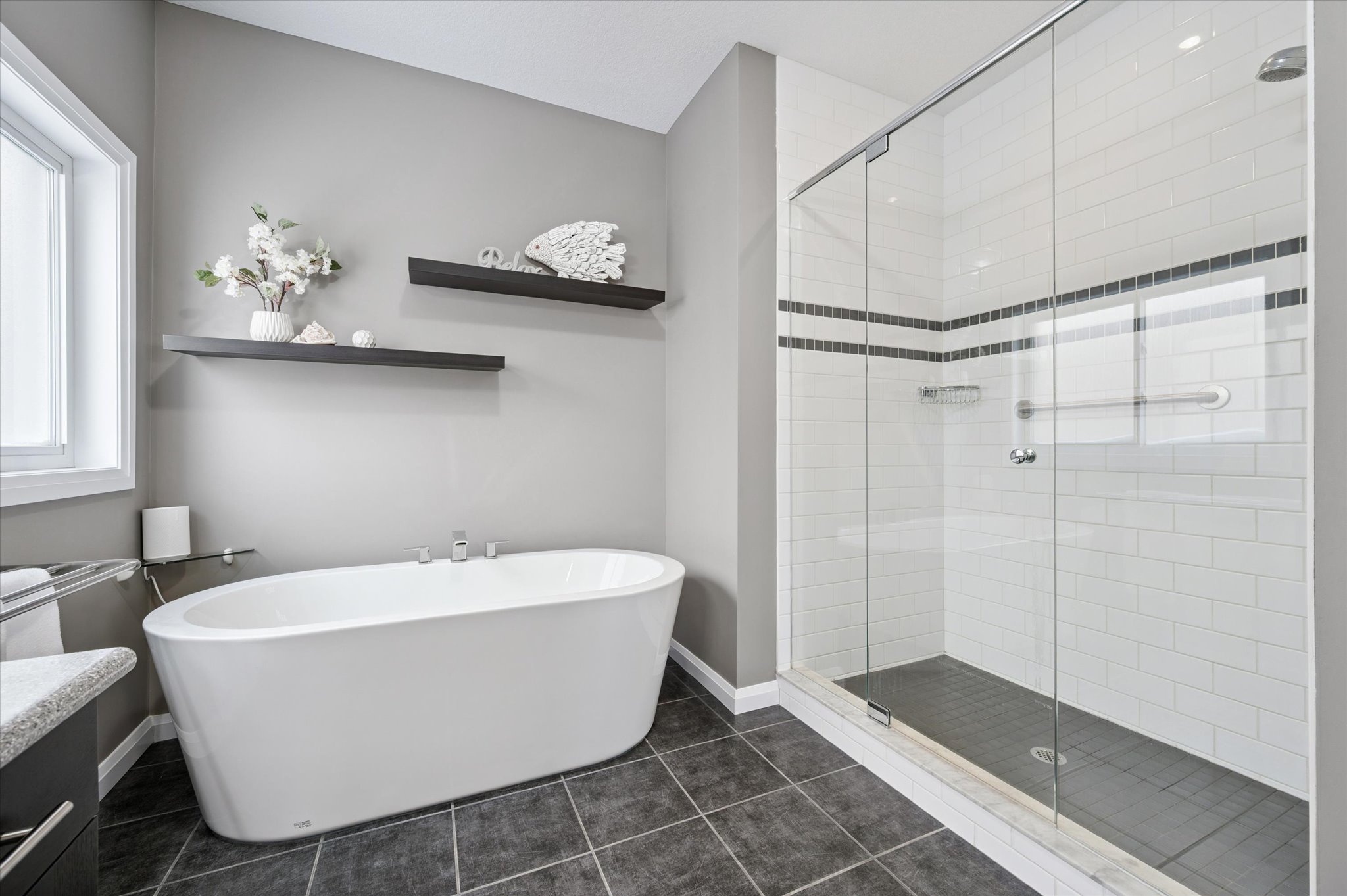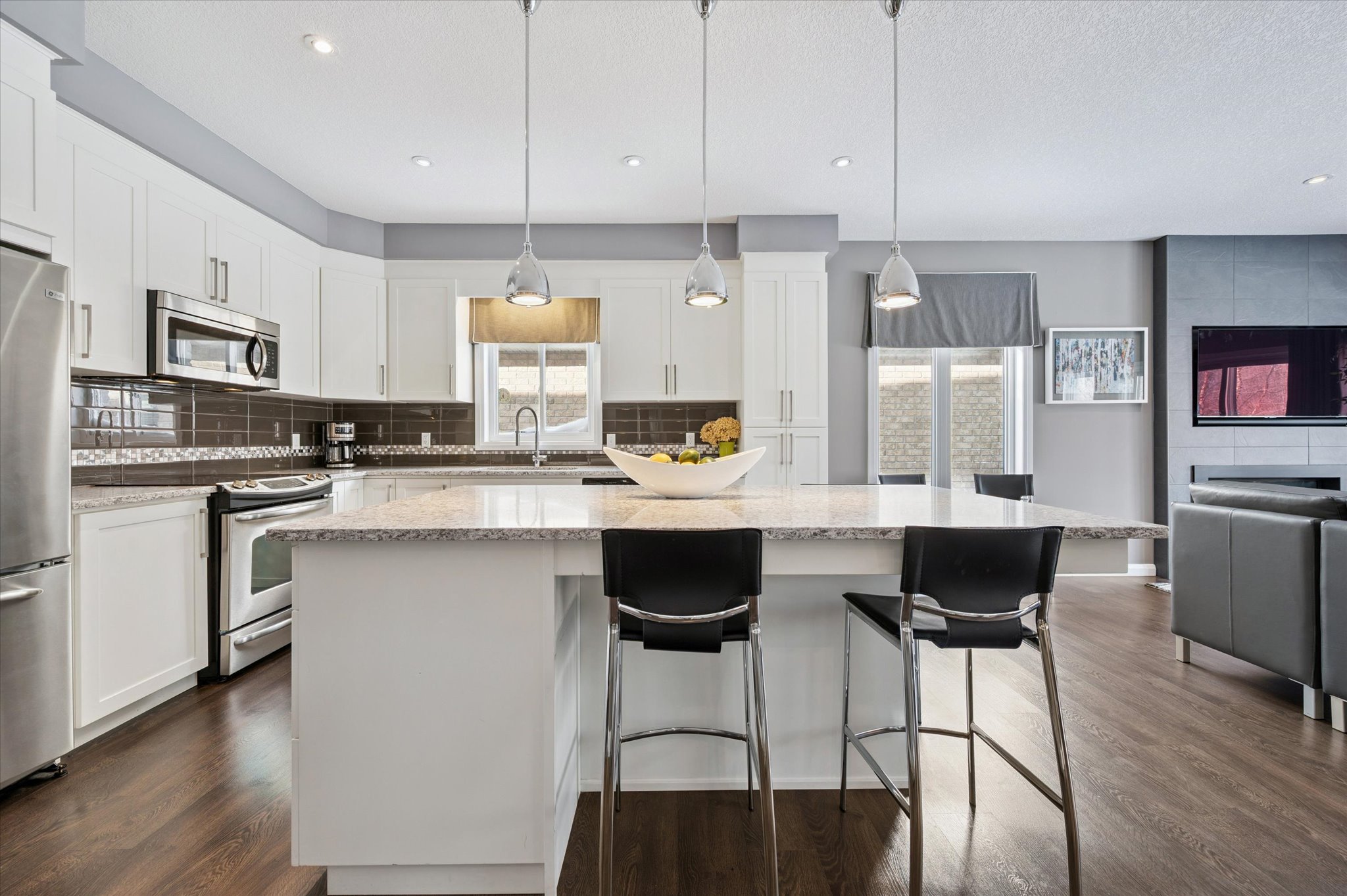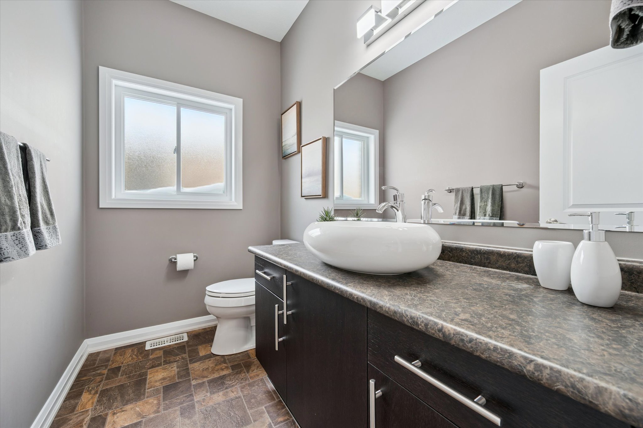 Enter through the front foyer, with an adjacent formal dining room with an extra large window looking out onto the front porch. Don’t need a formal dining room? This would be a perfect home office or living room. Head past the 2 piece powder room and into the modern open concept kitchen and great room. The kitchen’s ample cupboard space, wine rack, oversized island and built-in appliances, makes this space the heart of the home. The great room features plenty of natural light and an impressive custom gas fireplace. The rear sliding doors lead out to the backyard, overlooking the private green garden and trees. The large 2 tiered back deck has a BBQ line and is perfect for those summer family gatherings! The main floor primary bedroom has 2 closets and a 4 piece ensuite with walk-in shower and a freestanding bathtub. There is one additional bedroom found on the main floor. The partially finished basement features a large bedroom and 4 piece bathroom. If you are looking for separate living quarters for additional family members, the unfinished half of this basement is the ideal opportunity to design exactly what works for your needs.