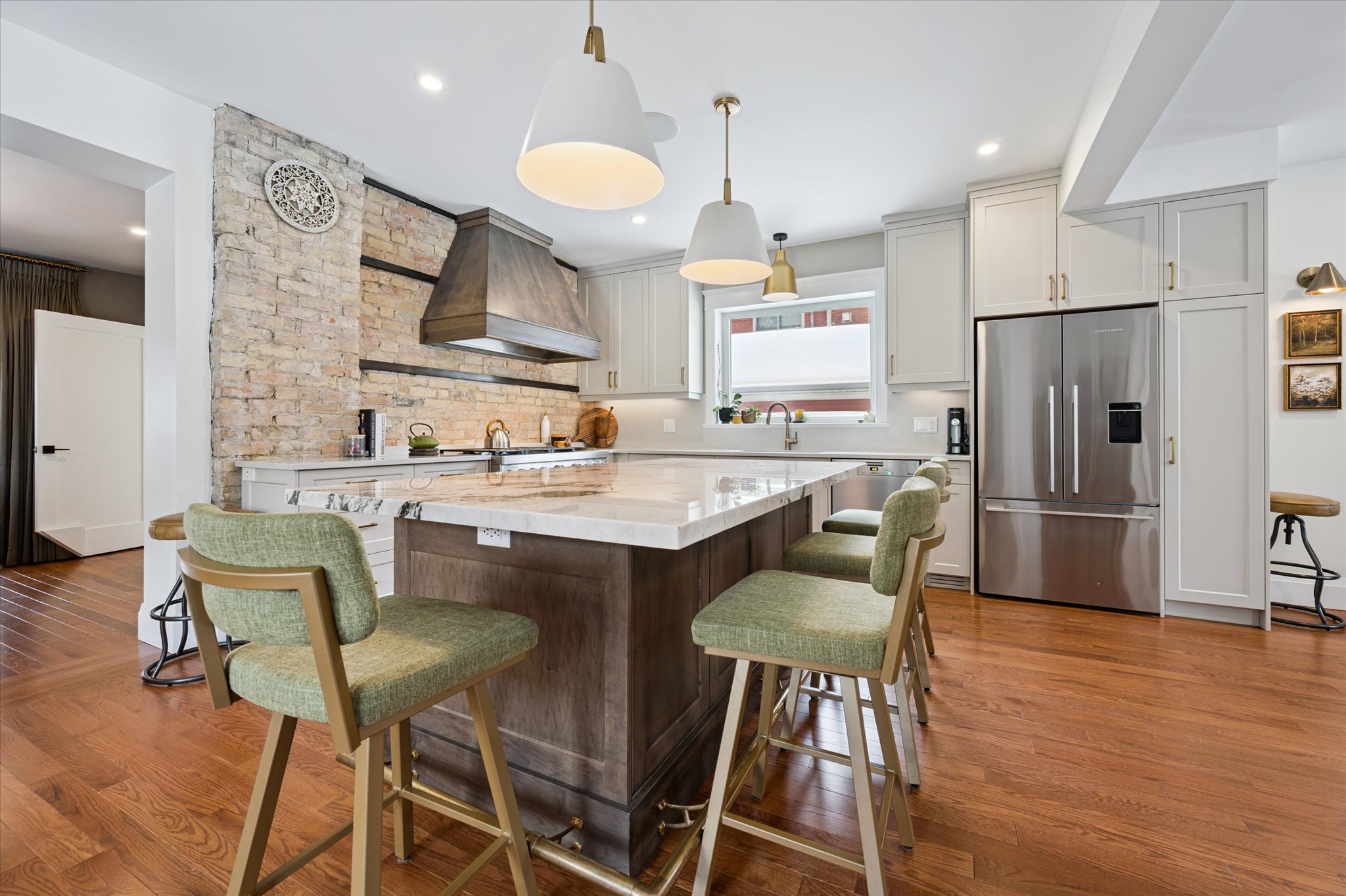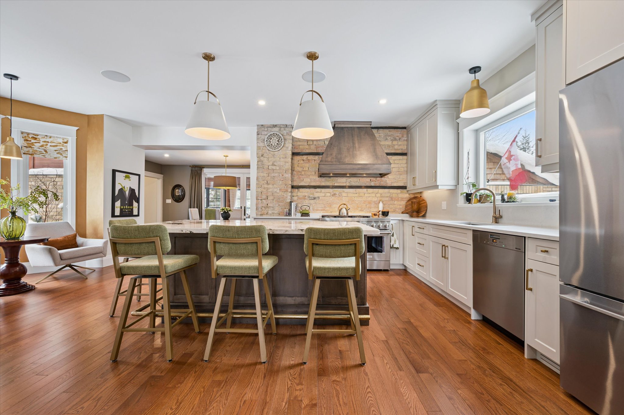 Enter through the front covered porch, and be instantly impressed with the high ceilings and gleaming hardwood floors. The living room features plenty of natural light, an impressive gas fireplace and built-in speakers. This “wow” kitchen is certainly the heart of this home! The kitchen island is the center feature with granite counters, anchored by the large gas stove and stunning brick wall, nodding back to the roots of this century home. The dining room was thoughtfully designed with cabinets serving as an open butler’s pantry and bar station. Plenty of room for guests to mingle for dinner and then wander out through the back sliding doors to the 3 season sunroom. Enjoy the warm summer evenings or cool brisk fall nights in the sunroom with an entire back wall of windows, overlooking the backyard and inground, salt water pool. No need to travel to a cottage, when this backyard feels just like being lakeside! Head upstairs to the open loft area, with skylight. The primary bedroom has a small balcony looking over the backyard, a large walk-in closet with stackable washer and dryer and a 4 piece ensuite bathroom with double sinks and a walk-in shower. 2 more generous sized bedrooms and a 4 pcs main bathroom for the kiddos. The fourth bedroom could serve as a second walk-in closet for the primary bedroom or a home office, exercise room or den.